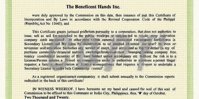 The SEC Certificate officially recognizes The Beneficent Hands Inc. as a non-stock, non-profit organization.