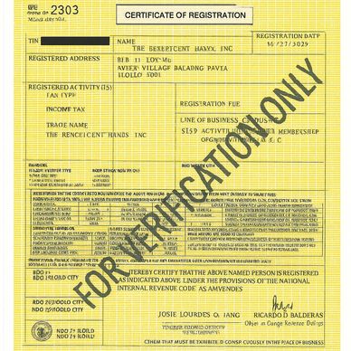 The BIR Certificate shows that tBH is registered for proper tax compliance.